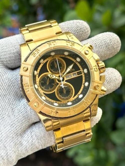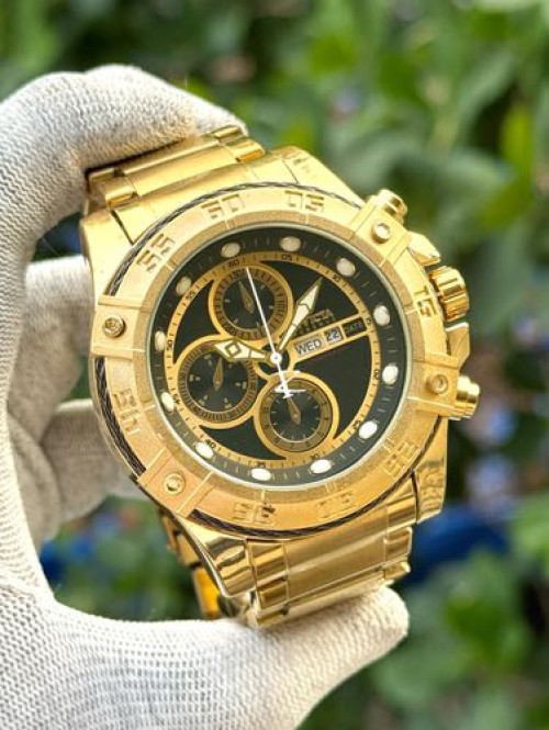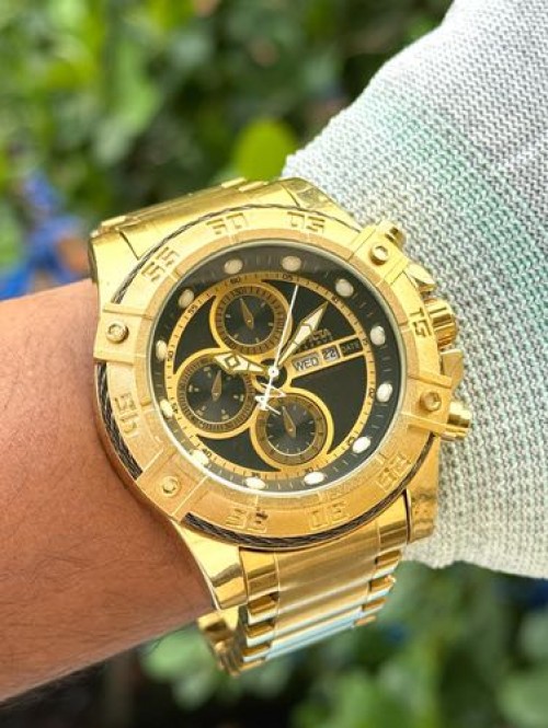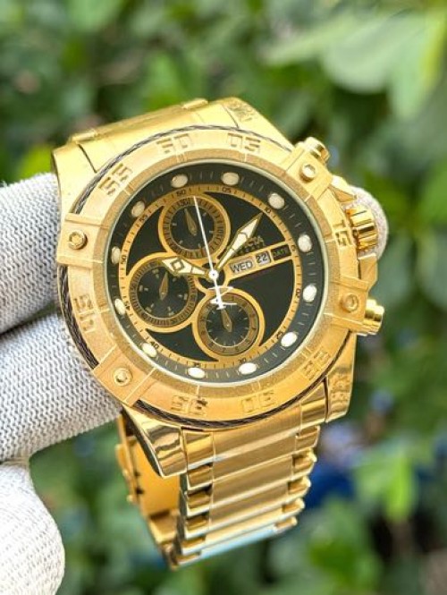 _This Invicta watch radiates pure luxury with its bold gold finish and striking, intricate dial design._